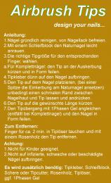 Sie benötigen einen Tipkleber, einen Schleifblock 100.er Körnung, eine Schere (besser eine Tipzange), ein Rosenholz, einen Tiplöser (zum späteren Entfernen) und ggf. ein 1Phasen UV Gel inklusive UV Lampe, für die Verwendung der Airbrush Tips als French Spitze.